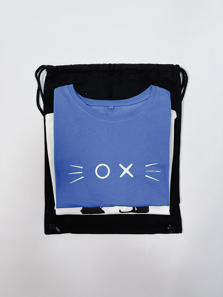 Set aus 2 Shirts + Turneutel: Shirt aus Biobaumwolle in blau mit Katerface Print, Shirt in weiß mit His Katers Mukke plus schwarzer Beutel mit His Katers Mukke Print. Größe L