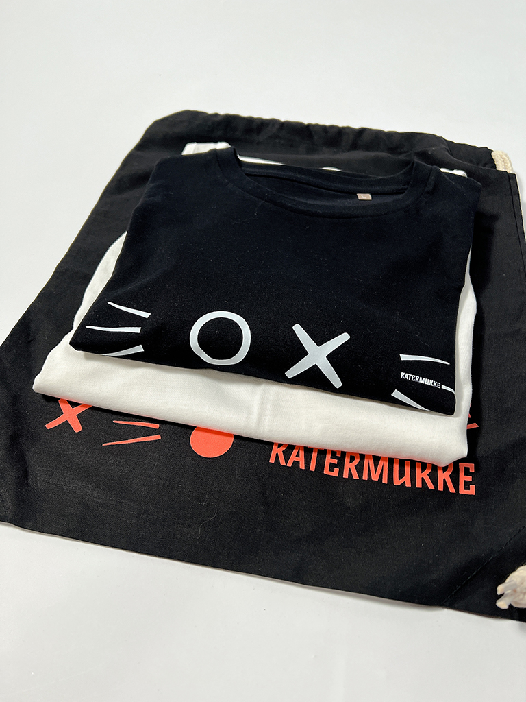 Set aus Shirt, Tank Top + Turnbeutel: Shirt aus Biobaumwolle in weiß, Tank Top aus Biobaumwolle in schwarz jeweils mit Katerface Print plus Turnbeutel. Größe L