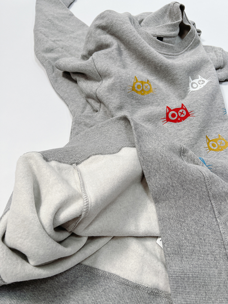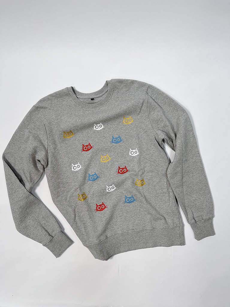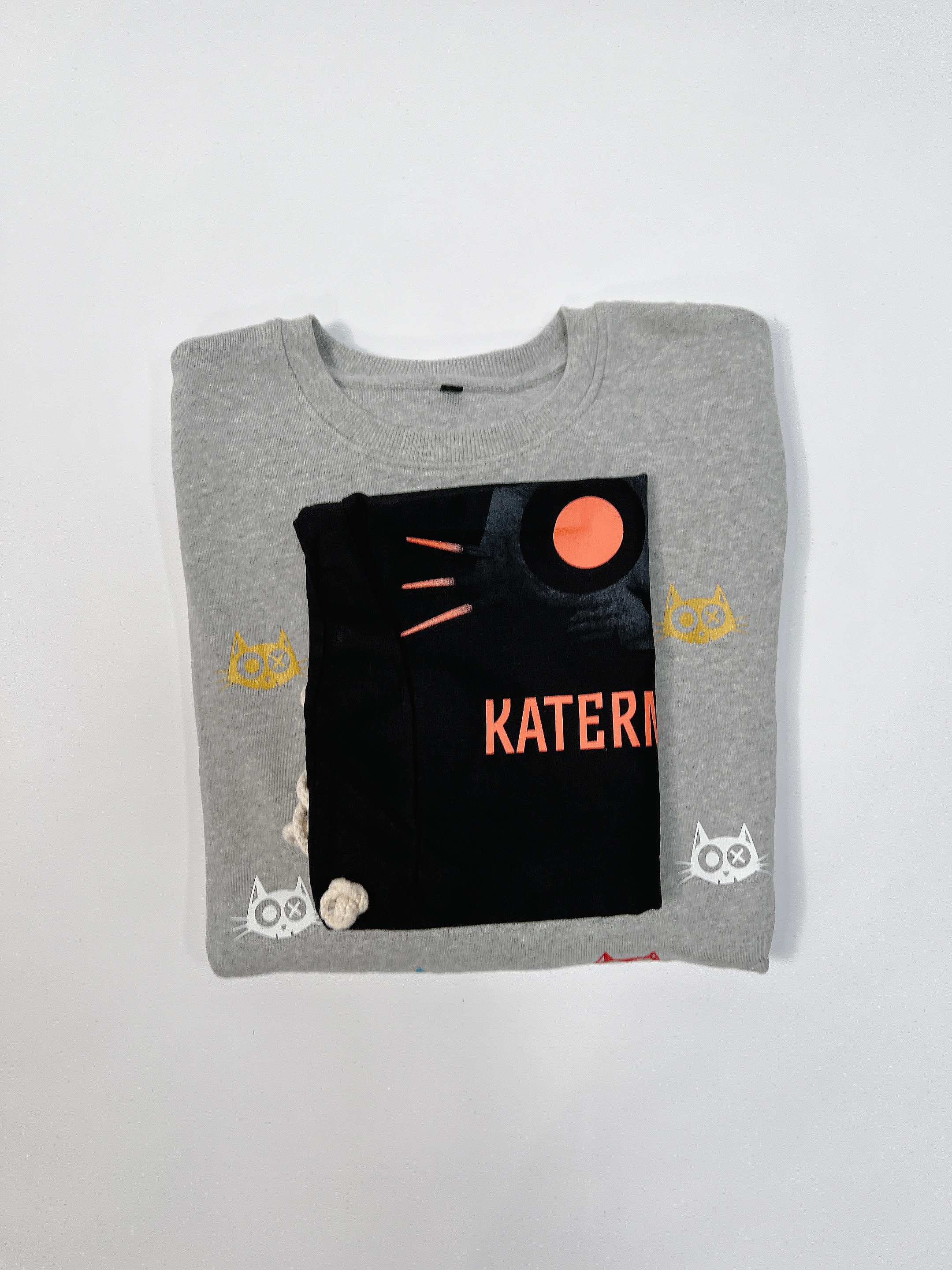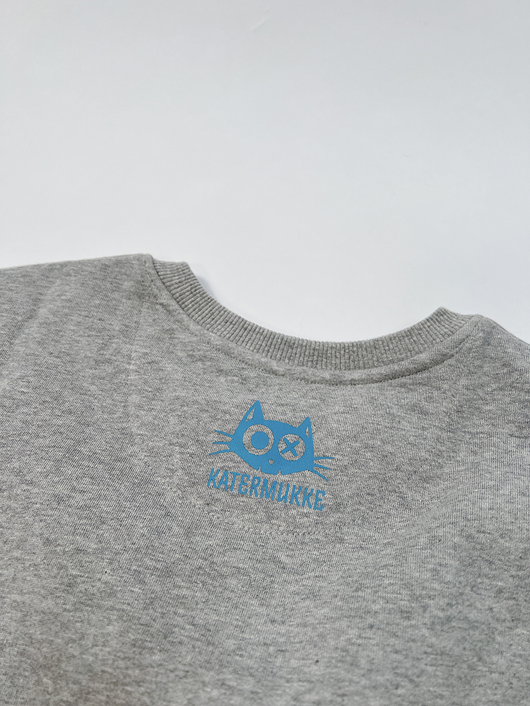 Set aus Sweater + Turnbeutel: Sweater aus Biobaumwolle in grau mit bunten Katerköpfen, schwarzer Turnbeutel mit Katerface Print. Größe L